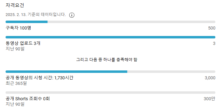 대부분 사람들이 원하는 건 조회수를 통한 광고일 겁니다. 그래서 유튜브 파트너스 수익 조건을 맞춰야 하죠. 멤버십 커뮤니티 수익 조건은 '구독자 500명 + 최근 90일간 동영상 업로드 3개 + 공개 동여상의 시청시간 3000시간(최근 1년) or 쇼츠 조회수 300만(최근 90일)' 을 달성하면 됩니다.