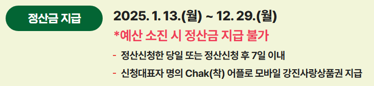 정산금 직브은 정산신청한 당일 또는 정산신청 후 7일 이내에 지급되고, 신청대표자 명의의 Chak어플로 모바일강진사랑상품권을 통해 지급된다고 해요! 그러니까 Chak어플 설치가 필수적이겠죠~?