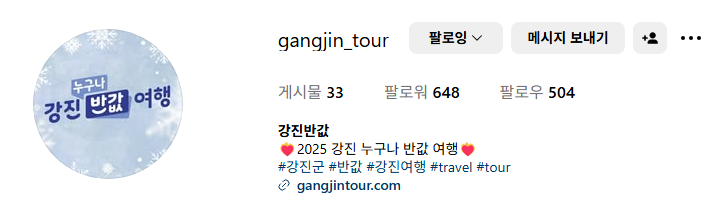 강진반값여행 인스타그램은 실시간 정보와 감성 콘텐츠를 통해 여행객과 소통하는 강진군의 대표 SNS 채널입니다. 여행 지원 사업을 보다 쉽게 확인할 수 있고, 지역의 풍경과 문화, 맛을 한눈에 담은 콘텐츠들이 가득합니다. 팔로우만 해도 강진의 생생한 여행 정보를 누구보다 먼저 받아볼 수 있다는 점에서 큰 매력이 있으며, 실제 여행 후기와 꿀팁들도 공유되고 있어 여행 전 꼭 참고해야 할 채널입니다.