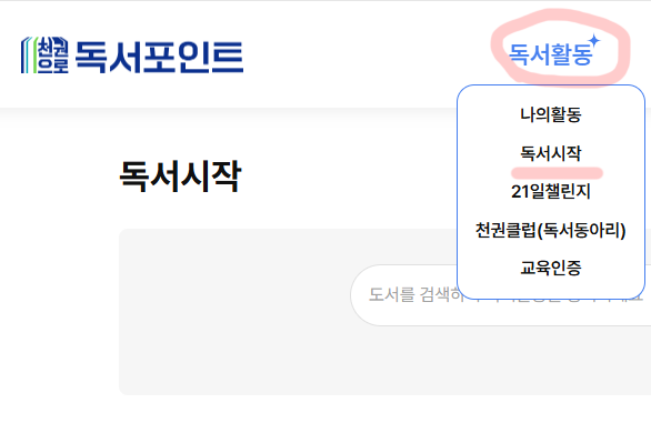 일단 기본적으로 책을 읽었다! 라고 인증하면 됩니다. 이걸 어디서 하느냐? 홈페이지의 '독서활동 > 독서시작' 메뉴로 이동해보세요.