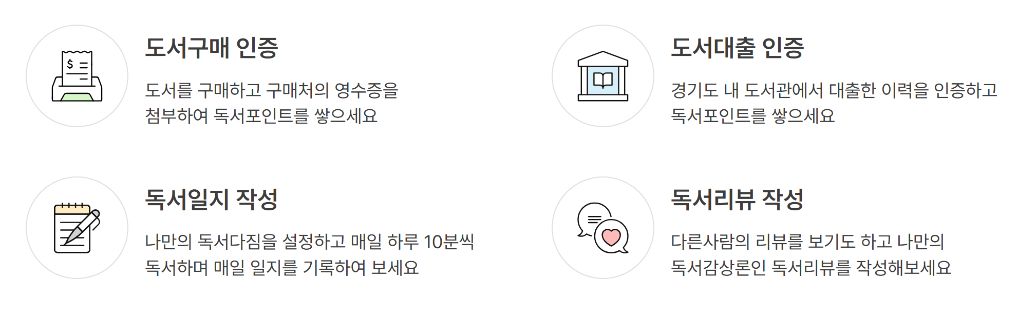 1,000P | 2,000P | 2권 | 도서관 대출증빙 사진 업로드 (경기도내 도서관만 인정, 전자책 월1권 가능) |