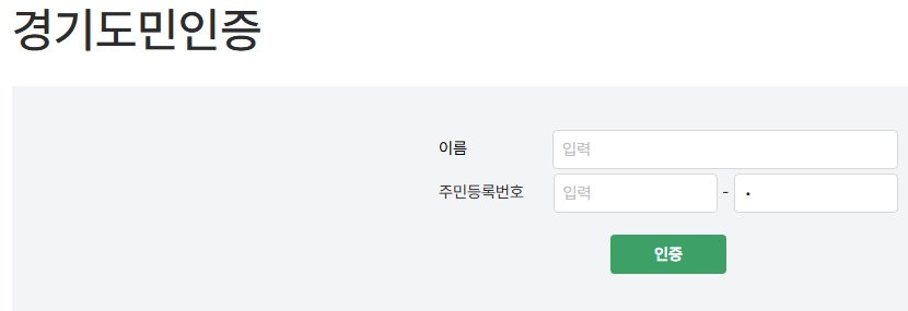 2. 경기도민인증: 회원가입을 다 진행하고 나면 경기도민인증을 하라고 합니다. 여기서 이름과 주민등록번호를 입력하고 인증 버튼을 누르면 자동으로 인증이 됩니다.