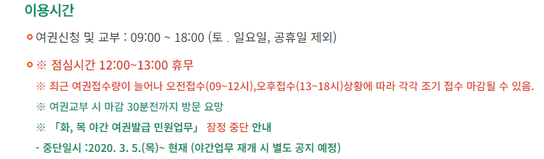 오산시 여권민원실은 매주 화요일 18:00 ~ 20:00에 야간운영을 합니다. 야간 운영시에는 긴급여권, 재증명 발급이 안 되니 꼭 주의해주세요.