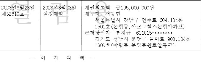 채무자인 서동현씨의 주소지가 소유자인 조OO씨와 다릅니다. 엥? 부부인데 주소지가 다르다고? 뭔가 이상하죠? 게다가주소지가 아크로힐스논현아파트네요? 월세든 전세든 무지막지하게 비싼 곳인데 말입니다?