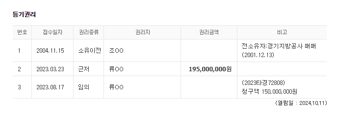 1. 등기권리를 보면 류OO이라는 사람이 채권자고 이 아파트에 1억 9,500만 원의 근저당권을 가지고 있네요. 근데 채무자와 소유자의 이름이 다릅니다. 이럴 경우 부부관계나 가족 관계일 가능성이 높아요. 류OO이 1억 9,500만원의 빚을 받지 못해서 이 집을 경매로 넘겨버린 사건인 듯 합니다.