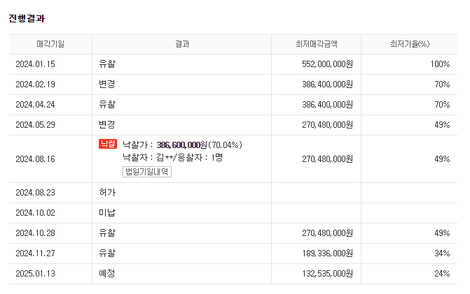 3. 그렇다 해도 이 아파트의 매매가는 4억 원이 넘어가는데, 굳이 낙찰을 포기했어야 했을까요? 다 물어줘도 시세차익이 나는데 말입니다? 그 이후에도 유찰이 2번이나 된 걸 보면 미납 이유가 전세금 때문은 아닌 것으로 보입니다. 등기권리만 봐서는 어떤게 문제인지 모르겠으나 약 1억 9천만 원의 최저가에도 유찰되었다는건 무언가 문제가 있어 보입니다.