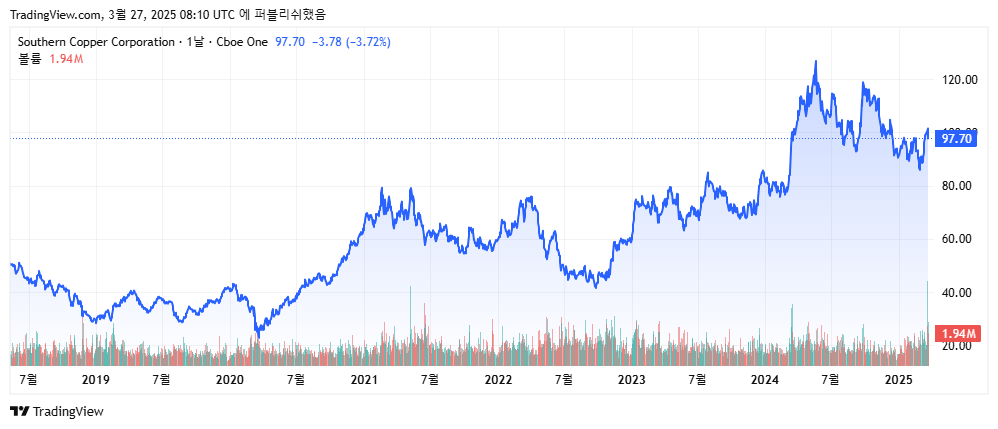 | SCCO | 페루·멕시코 중심 구리 채굴, 고정 수출 계약 다수. 미국 공급망 대체 기업으로 주목 | 약 4.2% |