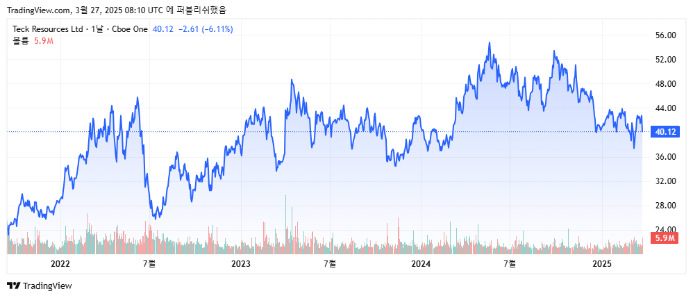 | TECK | 캐나다 기반 자원 종합 기업. 구리 사업 확장 중. 북미 공급망 수혜 기대 | 약 1.1% |