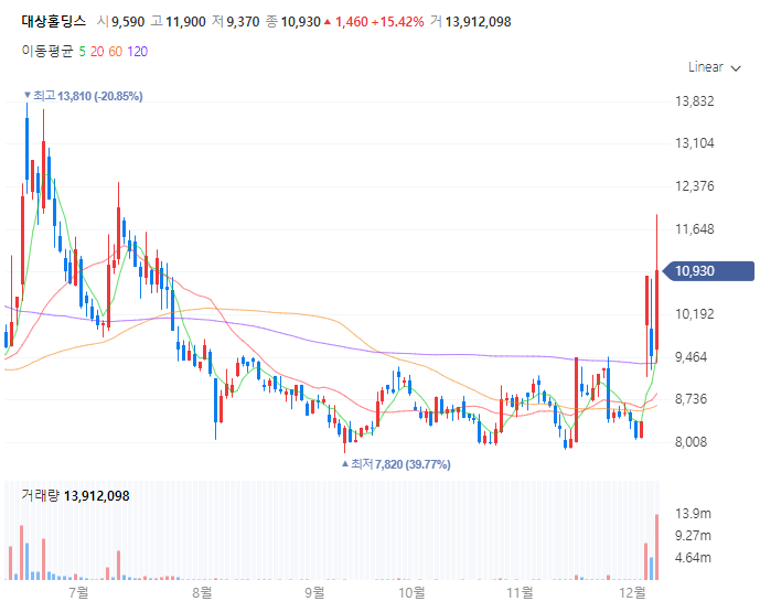 대상홀딩스는 식품 및 바이오 사업을 영위하는 기업으로, 한동훈 대표와의 간접적인 관련성으로 주목받고 있다. 특히 임세령 대상홀딩스 부회장이 2대 주주라는 점이 부각되었는데, 임 부회장은 한동훈 대표와 친분이 있는 배우 이정재의 연인으로 알려져 있다. 이러한 인적 네트워크를 바탕으로 대상홀딩스가 한동훈 테마주로 분류되어 주가 변동성이 커졌다. 또한 대상홀딩스의 주요 사업 영역인 식품 및 바이오 산업이 한동훈 대표가 강조하는 미래 성장 동력 산업과 연관되어 있어 정책적 수혜 가능성도 제기되고 있다. 이에 따라 대상홀딩스의 주가는 한동훈 대표의 정치적 행보와 발언에 민감하게 반응하고 있으며, 최근 비상계엄 사태 이후 급등하는 모습을 보였다.
