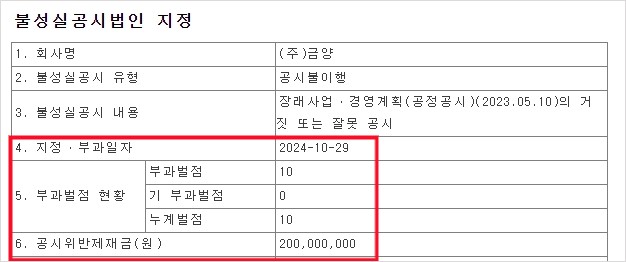 - 불성실공시법인 지정 벌점 10점, 이후 벌점 추가 시 거래정지 가능성