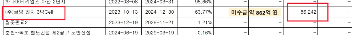 금양 기장공사를 하던 건설사는 동부건설이었음. 동부건설의 2024년 3분기 분기보고서가 11월 14일에 발표됨. 이 분기보고서를 보면 동부건설의 미수금이 나옴. 미수금에 금양의 기장공사 미수금 약 862억 원이 잡혀있음. 이게 무슨 말일까? 공사비를 지급하지 않았다는 거임. 금양이 금양 했음.
