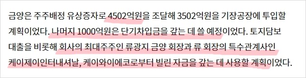 - 금양은 24.12.10 유상증자로 약 4500억 원을 마련하려 했음.
