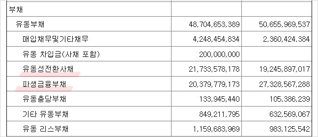 유동성전환사채와 파생금융부채가 유동부채의 거의 대부분임. 이는 전환사채 발행으로 인한 부채인데, 이자가 생기는 부채는 아니라서 안심할 수 있다, 라고 말하는 사람들이 간혹 있음. 단기적으로는 맞으나 장기적으로는 틀림. 전환사채라는건 결국 기관이 엑시트를 목적으로 투자를 한 것인데, 미래에 저 물량들이 전부 매도물량으로 나온다고 보면 됨.