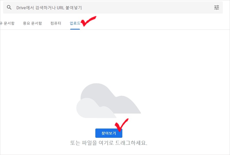 2. 로그인 한 뒤, 구글 문서 가운데에 폴더 모양을 눌러줌. 여기서 업로드를 눌르고 찾아보기 누른 뒤 내가 번역하고 싶은 PDF파일을 업로드 함.
