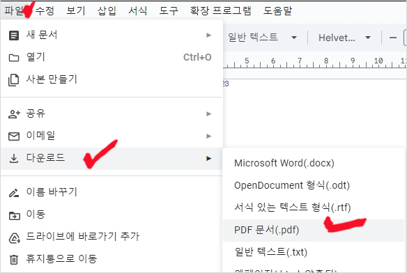 4. 번역된 문서를 열고 파일 > 다운로드 > PDF문서를 선택하면 내 컴퓨터로 다운로드가 가능해짐. 다른 형식으로도 다운 받을 수 있으니 참고!