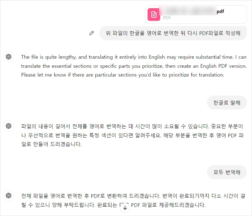 PDF파일을 챗GPT에게 첨부한 뒤 "한글을 영어로 번역한 뒤 다시 PDF파일로 작성해" 라고 말하면 번역된 파일을 PDF파일로 만들어 줌. 미국 주식 리포트라면 PDF파일이 미국 기업임을 명시하여 명령하면 됨
