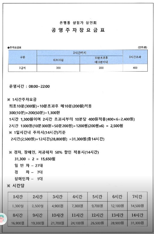 • 요금 : 최초 10분 300원, 10분 초과 후 매 10분당 200원 적용, 1시간당 1300원, 2시간 초과시부터 10분당 400원 적용, 14시간 주차시 31,300원