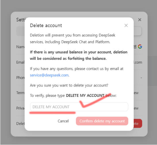 딥시크 개인이메일로 가입했을 때 탈퇴 방법