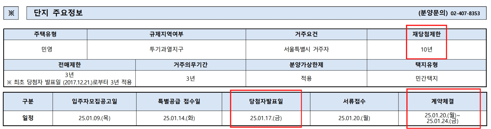 일정을 보면 입주자모집이 1월 14일이고, 당첨자발표일이 1월 17일 금요일로 되어있죠? 17일 00시에 당첨자발표가 나옵니다. 당첨자는 25년 1월 20일 ~ 24일에 계약체결을 하면 되며 재당첨제한은 10년입니다.