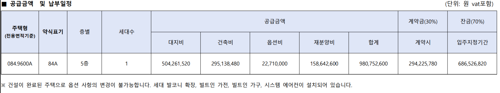 이미 건설이 완료된 주택으로 옵션 사항의 변경이 불가능하며, 세대 발코니 확장, 빌트인 가전, 빌트인 가구, 시스템 에어컨이 설치되어 있는 아파트입니다. 송파에 있는 신축 아파트를 2017년 가격인 10억도 안 되는 가격에 분양받는 것이니 완전한 로또죠. 최소한 5억원의 시세차익이 기대되는 바입니다.