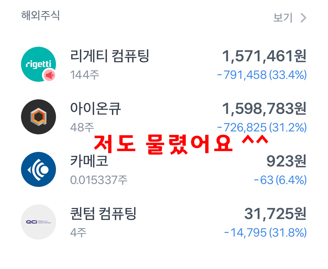 - 아이온큐 실적 부진: 같은 양자컴 기업인 아이온큐의 4분기 실적발표가 개판이 났습니다. 순손실이 크게 확대되었고 유상증자까지 한다고 발표했어요.
