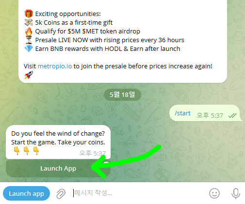 1. 메트로피오 가입 시작(https://t.me/metropio_game_bot/play?startapp=10720374929447453098): 옆에 링크를 누르면 텔레그램으로 이동하게 되는데 여기서 게임이 시작됩니다. 대화방에서 시작을 누른 다음 Launch App을 누르면 게임이 시작됩니다.
