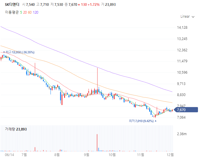 이것과는 별개로 SK디앤디의 주가는 처참합니다. 투자할 가치가 없는 기업이 되어버리고 있죠. 모건스탠리와 합작하여 월세 시장에 진입했지만 그 수익은 기업 수준에서 보기엔 좀 부족합니다. 모건스탠리 월세 관련주로 잡히기는 하지만 큰 수혜를 얻지는 못할 듯 하네요.