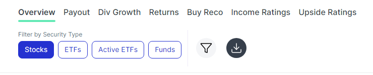 Dividend.com은 미국주식 배당금 순위를 여러가지 조건에 맞춰서 검색할 수 있도록 해놨습니다. 개별 주식도 가능하고 ETF도 가능하고, 액티브ETF검색도 가능하고 일반 펀드 검색도 가능하죠.