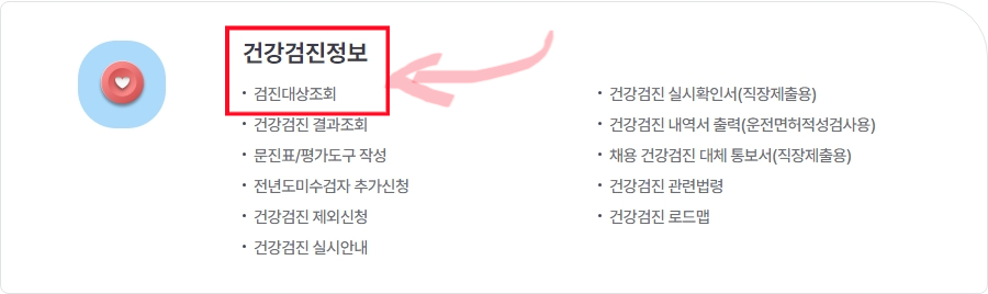 - '건강검진 대상 조회'를 선택하면 바로 확인할 수 있어요.
