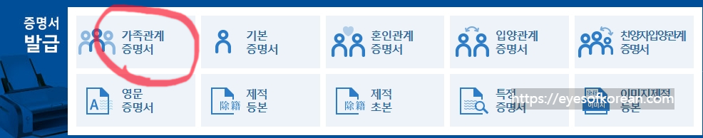 2. 들어가자마자 첫 화면에 나오는 '증명서 발급' - '가족관계증명서' 를 눌러보세요. 그러면 가족관계증명서를 발급받을 수 있는데 여기서 부모님의 등록기준지(본적)을 확인할 수 있습니다. 내 가족관계증명서가 아니라 부모님의 가족관계증명서까지 다 볼 수 있거든요.