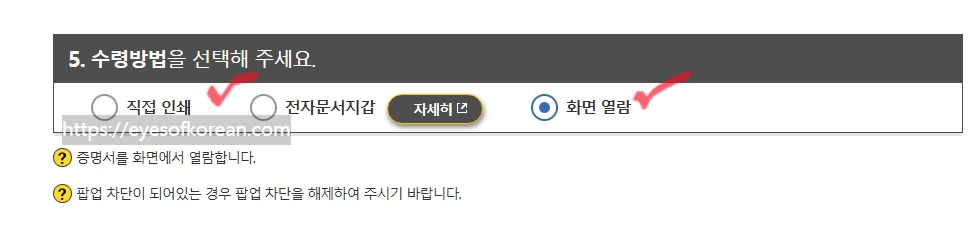 4. 수령방법을 선택하세요. '직접 인쇄'를 하고 싶다면 직접 인쇄를 누르시고 그냥 화면에서 보고 싶으면 '화면 열람'을 선택하면 됩니다.