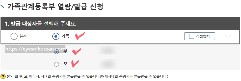 3. 가족관계증명서 발급화면에서 개뿔딱지 짱나는 본인인증을 마무리하고 진짜 발급화면에 가면 '발급 대상자'를 선택할 수 있습니다. 여기서 가족을 누르고 부모님 중 아버지의 등록기준지를 확인할 건지 어머니의 등록기준지를 확인할 건지 체크하세요.