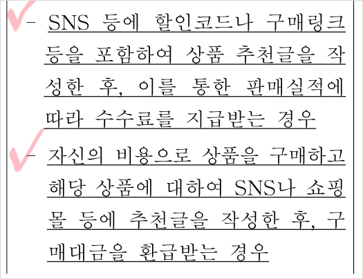 - SNS등에 할인코드나 구매링크를 포함하여 상품 추천글을 작성하는 것