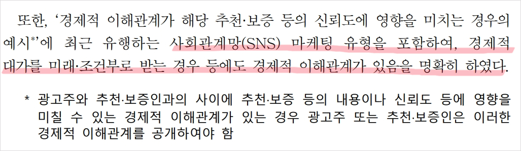 *추천·보증인이 광고주로부터 현금이나 해당 상품, 상품권, 적립포인트, 할인혜택 등 경제적 대가를 받거나 광고주로부터 직접 고용된 상태에서 추천·보증, 공동구매 주선 등을 하는 경우 이와 같은 경제적 이해관계를 명확히 표시하여야 함