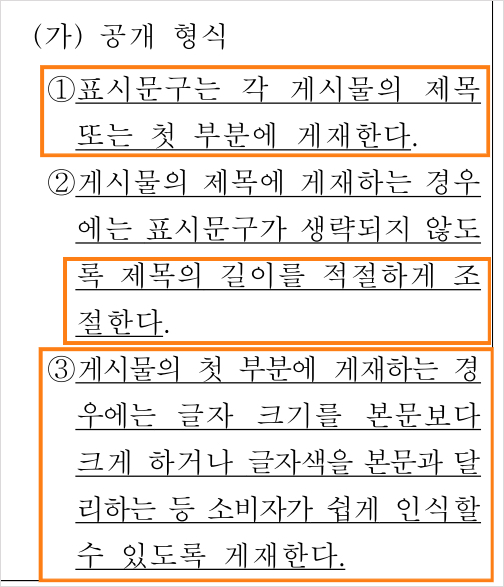 - 게시물의 첫 부분에 게재하는 경우 글자 크기나 색을 달리하여 소비자가 '쉽게 인식하도록' 게재