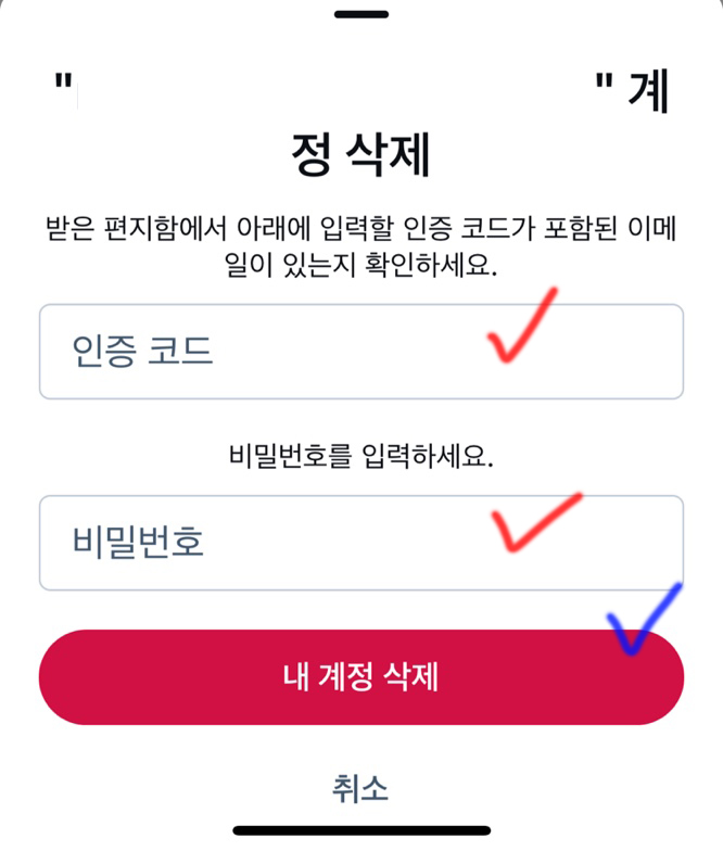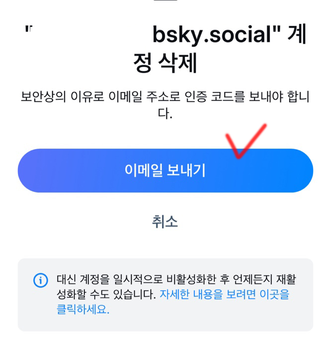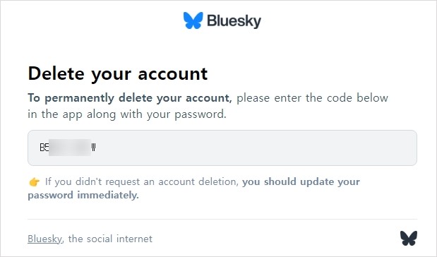 5. 이메일로 온 블루스카이 탈퇴 인증코드를 입력한 후 비밀번호까지 입력하고 '내 계정 삭제'를 누르면 나의 계정이 완벽하게 삭제됩니다.