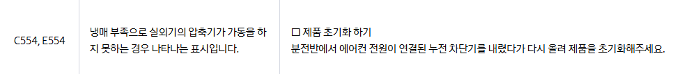 🏃거두절미하고 정답만 말하면 이 에러코드 E554, C554는 냉매 부족이라 셀프해결 불가능입니다. 삼성전자 서비스센터 예약하셔요;; 아래 페이지로 이동하시면 바로 예약 가능합니다.