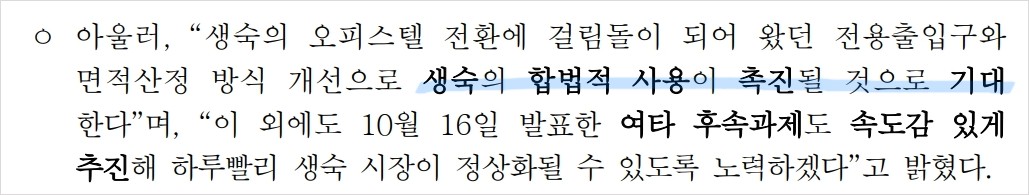 ✅ 이와 동시에 오피스텔의 건축 규제도 완화하면서 생숙의 아파트화를 추진하려는 듯? 자세한 내용은 아래 다른 글에
