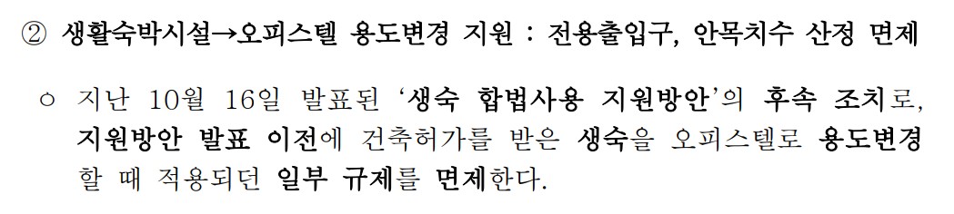 임. 지금까지는 생활숙박시설이 오피스텔로 용도변경 되려면 오피스텔 전용출입구가 있었어야 했는데 건축이 끝난 건물에 전용출입구를 새로 만든다는건 사실상 불가능에 가깝기 때문에 이를 없애버린 것. 또한 안목치수 산정 면제도 마찬가지. 건축이 이미 다 끝났는데 건물 넓이를 넓힐 수가 없으니 이를 없앤 것.