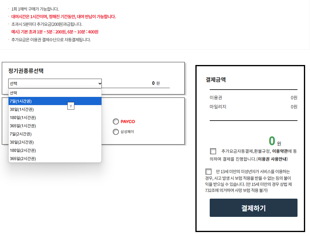 - ‘정기권’ 선택 후 원하는 기간과 시간(1시간/2시간) 선택
