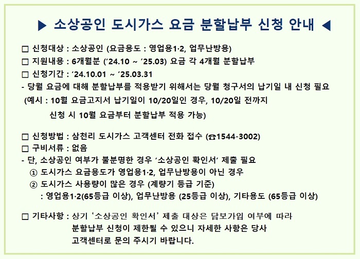 요즘 도시가스 요금이 너무 심하게 올라서 걱정입니다. 이런 와중에 소상공인 도시가스요금 분할 납부 신청을 받고 있으니, 삼천리 도시가스를 이용하고 있는 분들은 어려운 시절 분할납부로 잘 이겨냈으면 좋겠습니다.