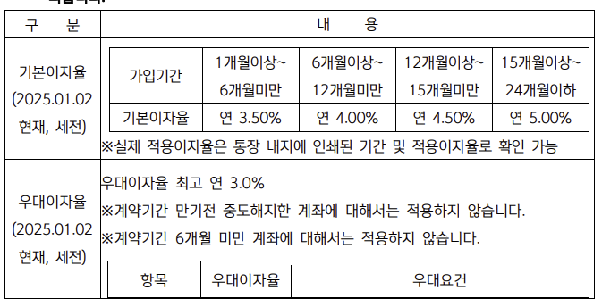기본금리에 우대금리를 더하면 최대 연 8.0%까지 받을 수 있어요. 2025년 기준으로 금리는 가입 기간에 따라 다르게 적용됩니다.