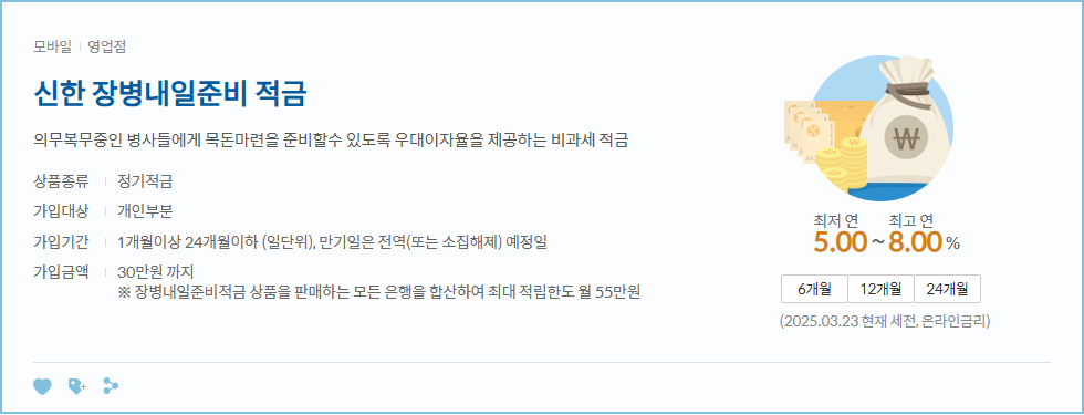 신청 방법은 영업점 또는 신한은행 SOL 앱(모바일)에서 간편하게 가능해요. 그냥 폰만 들고 어플로 신청 가능하니까 잔말말고 가입하세요. 이상한 코인이나 주식 하는 것보다 훨씬 낫습니다. 군대에서 돈 제대로 모아서 나오면 진짜 와.. 요즘 군인들 리얼 좋더라고요..;;