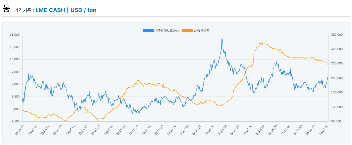 이 글의 주제가 '실시간 구리 가격 보는 곳'이니까 일단 실시간 구리 가격부터 보죠. 글의 작성일인 2025년 2월 11일 기준 구리 가격은 지금 톤당 20만달러네요. 여기서 또 하나 다른 그래프가 보이죠? 네 재고량입니다. 구리 가격 뿐만 아니라 재고량까지 볼 수 있다고요!!