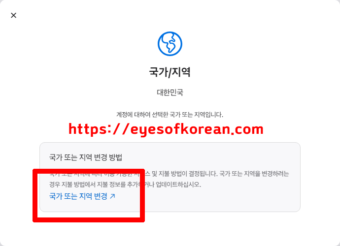 - 국가 또는 지역 변경을 누르고 변경하면 끝.