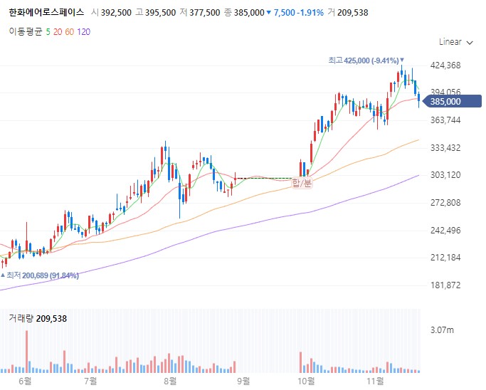 한화에어로스페이스는 ATACMS를 따서 KTSSM을 만든 주역임. 이 친구는 우크라이나 전쟁에서 발발한 유럽vs러시아와의 전쟁 덕분에 주가가 떡상한 친구이기도 함. 그러니 당연히 주가가 오르지 않을까? 최근 주가가 떡락하고 있기는 하지만 바이든이 퇴임 전 똥을 뿌리고 가면서 우크라이나 러시아 전쟁은 트럼프 이후에도 끝나지 않을 가능성이 높아졌음.