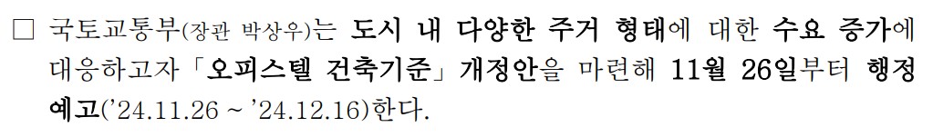 오피스텔 건축 기준 개정안을 마련해 11월 26일부터 행정예고한다. 라고 되어 있음.