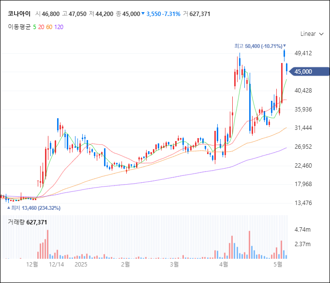 실제로 코나아이의 주가를 봐도 빵빵 뜨는 느낌이 있어요. 세력도 많이 들어온 것 같고 말이예요. 대장주 같죠~?
