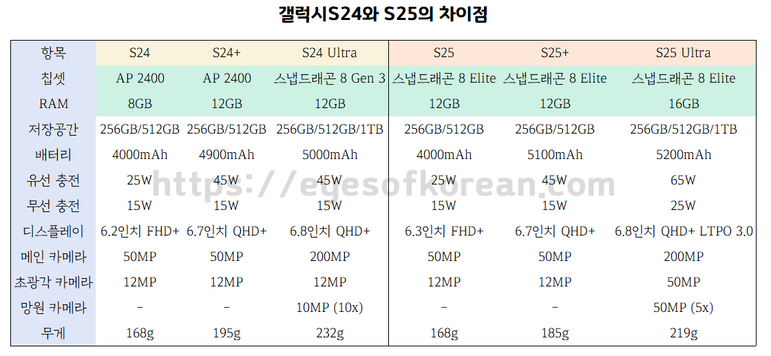 ✅갤럭시S24와 S25의 차이점이라면 프로세서와 RAM 입니다.