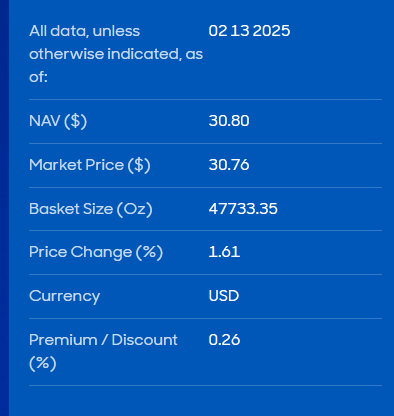 2월 13일 기준 SIVR의 현재 기준가는 30.76입니다. 즉, 30.76달러만 있으면 은에 투자할 수 있다는 장점이 있는거죠. 더 자세한 정보